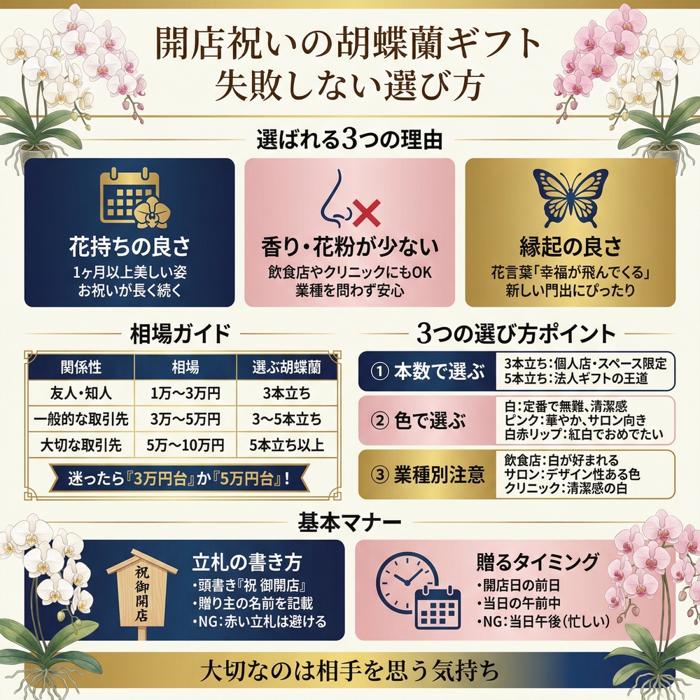 今回は、開店祝いの胡蝶蘭ギフトで失敗しないための選び方からマナーまで、プロの視点で詳しく解説してきました。